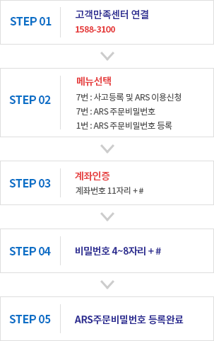 - 메뉴선택 7번:사고등록 및 ARS 이용신청 7번:ARS 주문비밀번호 1번:ARS 주문비밀번호 등록
