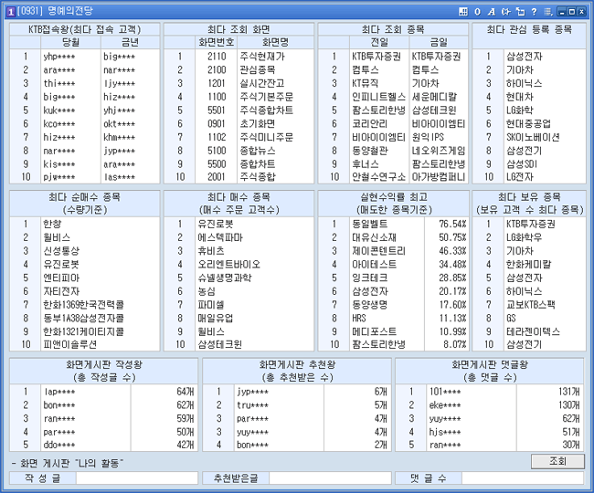 메뉴별로 hts에 접속하여 고객들이 가장 많이 체크한 항목을 1~10위 까지 내역을 보여주는 화면입니다.