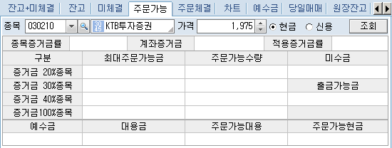 '°èÁÂÁ¤º¸ ¿µ¿ª'¿¡¼ 'ÁÖ¹®°¡´É' ÅÇÀ» ¼±ÅÃÇϸé ÇØ´çÁ¾¸ñÀÇ ÁÖ¹®°¡´É ±Ý¾×À» Áõ°Å±Ýº°·Î Á¶È¸ÇÒ ¼ö ÀÖ½À´Ï´Ù. ¶ÇÇÑ ÁÖ¹®ÇÒ Á¾¸ñÄڵ带 ÀÔ·ÂÇÑ ÈÄ '°¡°Ý'¶õ¿¡ ¸Å¼öÇÒ ÁÖ¹®°¡°ÝÀ» ÀÔ·ÂÇϰí 'Á¶È¸'¹öưÀ» Ŭ¸¯Çϸé ÁÖ¹®°¡´É±Ý¾×°ú À̸¦ ±Ù°Å·Î »êÃâµÈ ¸Å¼ö°¡´É¼ö·®À» Á¶È¸ÇÒ ¼ö ÀÖ½À´Ï´Ù