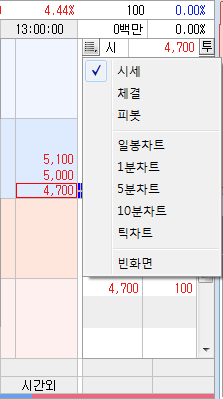 를 클릭하면, ‘시세/체결/피봇/일봉차트/1분차트/5분차트/10분차트/틱차트’ 등의 데이터를 조회할 수 있습니다.