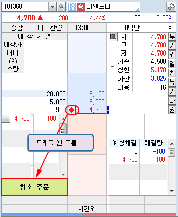호가창에 미체결 아이콘을 취소주문 영역으로 드래그 하면 미체결 종목에 대한 취소 주문이 실행 되며, 다른호가로 드래그하면 정정 주문이 실행됩니다.