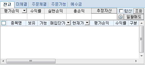 잔고 : 현재 계좌의 평가손익, 수익률, 실현손익 등의 현황과 보유종목에 대한 일괄매도주문을 실행할 수 있습니다. 또한 버튼을 클릭하면 매매시 수수료,세금 등을 반영한 자산 추정금액을 표시합니다.