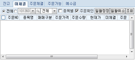 미체결 : 당일 전체 또는 종목별 미체결 현황을 조회할 수 있으며, 조회된 미체결 내역에 대하여 장중 일괄정정/ 일괄취소 주문을 실행시킬 수 있습니다.