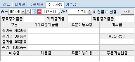 주문가능 : 해당 종목군정보와 계좌의 설정된 증거금율에 의한 최종 적용증거금율을 확인할 수 있으며, 이에따라 계산된 최대주문가능금액, 주문가능수량이 조회됩니다.