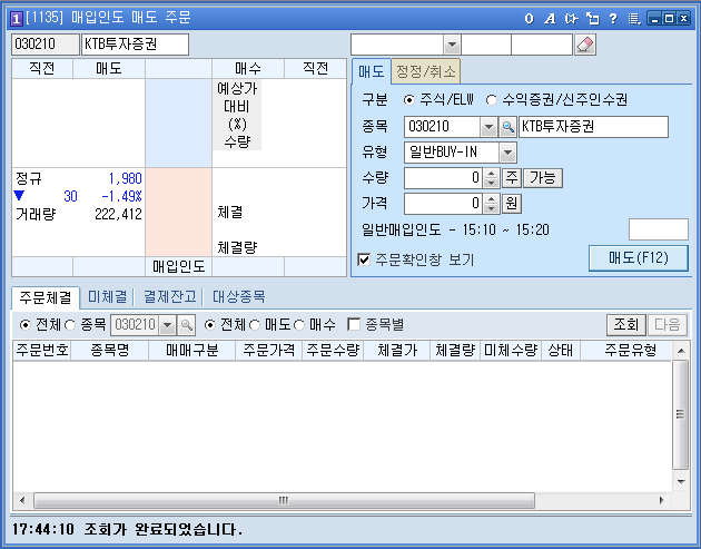 정규장외 유가증권을 매입하기(buy-in)위해 거래소가 개설하며, 계좌에 매입인도 시장에 개설된 유가증권을 보유하고 있으면 매도를 실행할 수 있는 화면입니다.