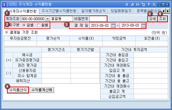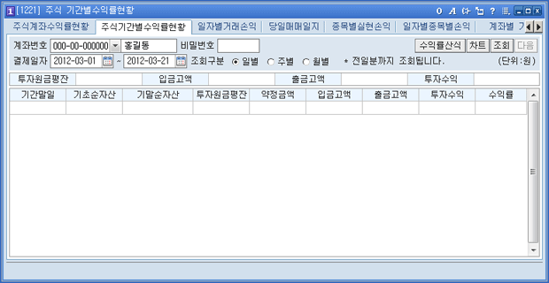 ¹öưÀ» Ŭ¸¯ÇÏ½Ã¸é ¡°[1221] ÁÖ½Ä ±â°£º°¼öÀÍ·üÇöȲ¡± âÀÌ ÆË¾÷ µÇ¾î, ¼öÀÍ·üÀ» ¼öÄ¡, ¹× Â÷Æ®·Îµµ Á¶È¸ÇÏ½Ç ¼ö ÀÖ½À´Ï´Ù.