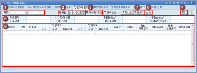 ¡®°¡°Ý, ¼ö·®, ¸ÅÀÔ/¸Åµµ±Ý¾×¡¯ µîÀÇ ´çÀÏ ¸Å¼ö/¸Åµµ ³»¿ª°ú ¼öÀÍ·ü ÇöȲÀ» »ó¼¼ÇÏ°Ô Á¶È¸ÇÒ ¼ö ÀÖ½À´Ï´Ù.