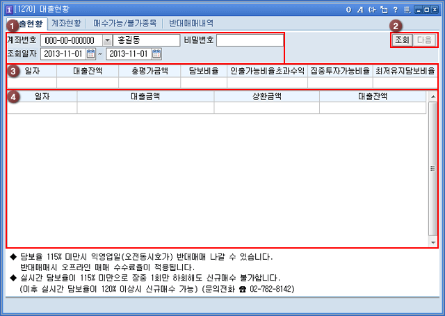 '조회' 버튼을 클릭하면 대출현황이 조회되고, 데이터가 많은 경우 '다음'버튼을 클릭하여 다음 데이터를 확인할 수 있습니다.