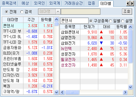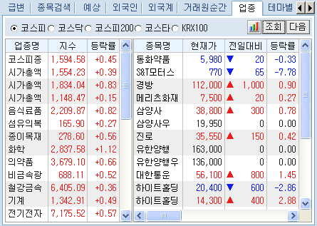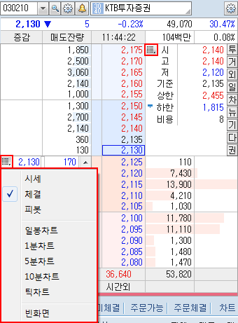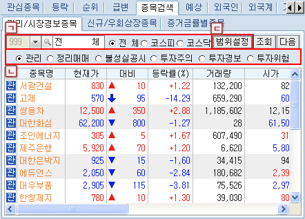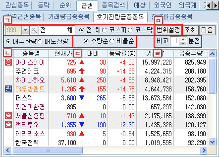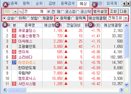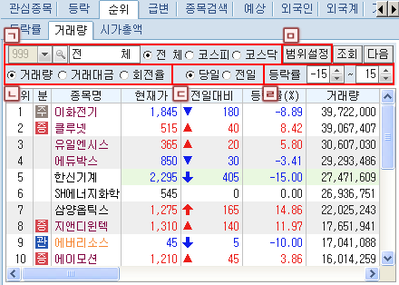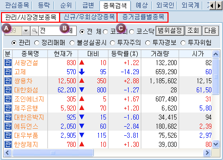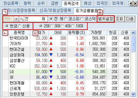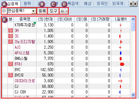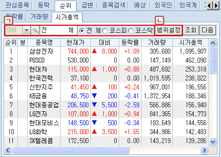 ¹öưÀ» Ŭ¸¯Çϸé Á¤±Ô½ÃÀå¿¡¼ÀÇ ÇöÀç ½Ã¼¼»óÅÂ/¿¹»óü°á»óÅÂ/½Ã°£¿Ü»óÅÂ/½Ã°£¿Ü+¿¹»óü°á»óÅ µîÀÇ ½Ã¼¼ Á¶È¸ Á¾·ù ¼±Åðú °ü½É±×·ìÀÇ Á¶È¸/ÀúÀå ¹× ±×·ì À̸§ º¯°æ µîÀ» ¼±ÅÃÇÒ ¼ö ÀÖ´Â µµ±¸¹öưÀÔ´Ï´Ù.