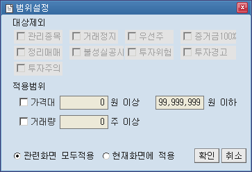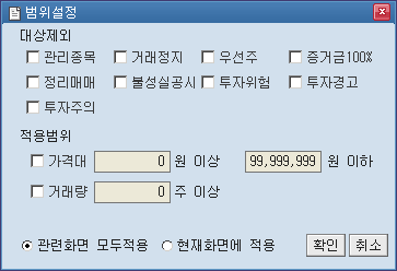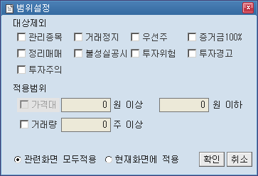 ¹öưÀ» Ŭ¸¯ÇÏ¸é ¡®¹üÀ§¼³Á¤¡¯ âÀÌ ÆË¾÷ µÇ¸ç, ´ë»óÁ¦¿ÜÇ׸ñ°ú Àû¿ë¹üÀ§¸¦ ¼³Á¤ÇÒ ¼ö ÀÖ½À´Ï´Ù.