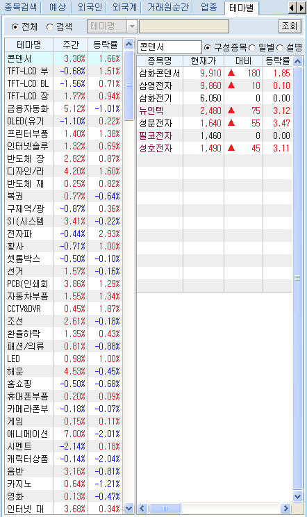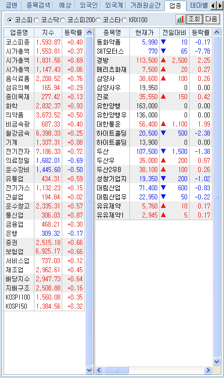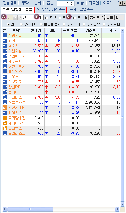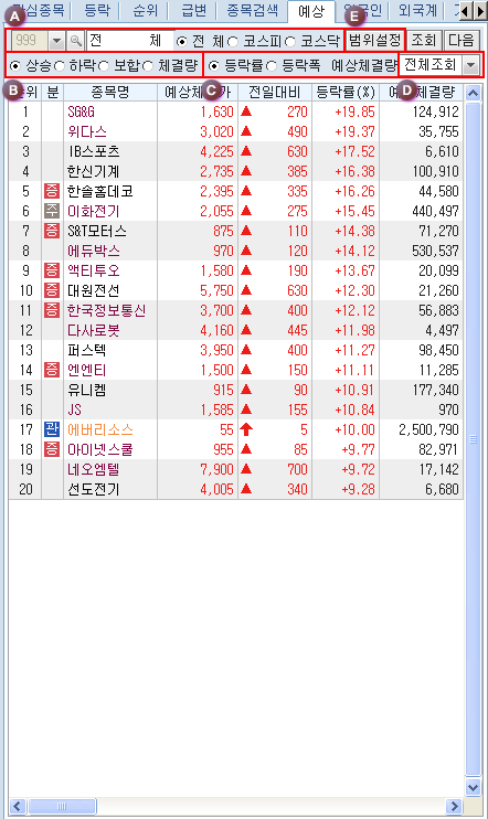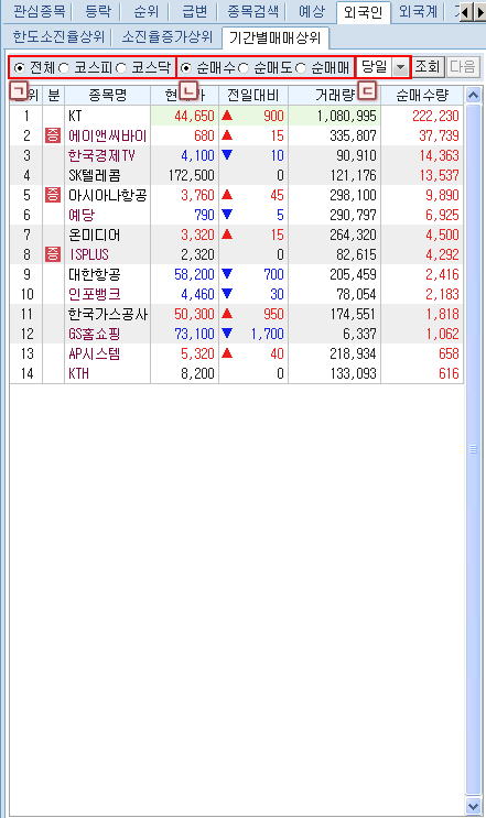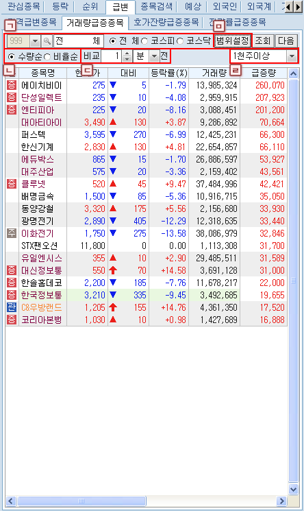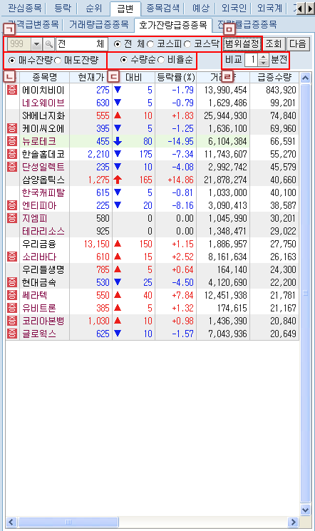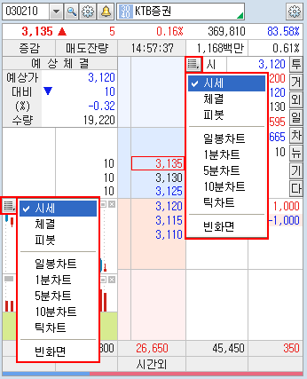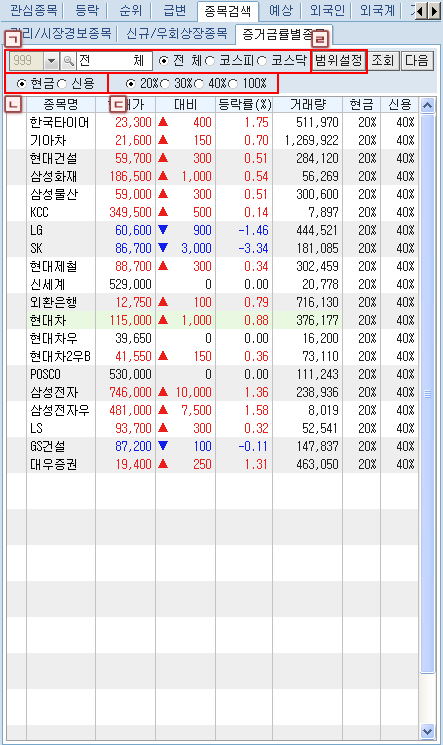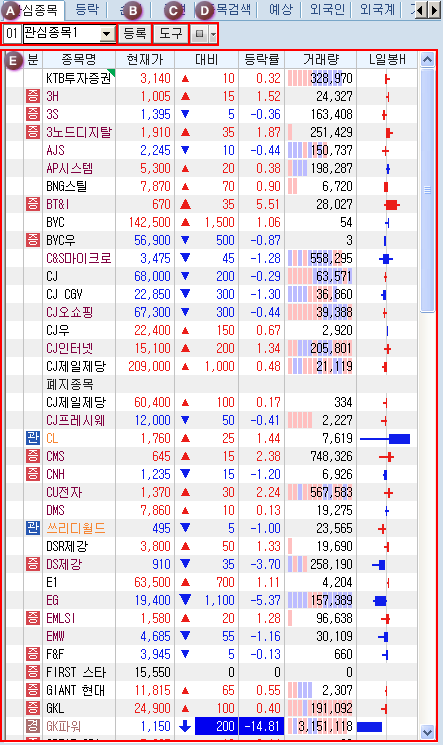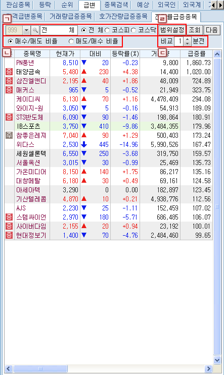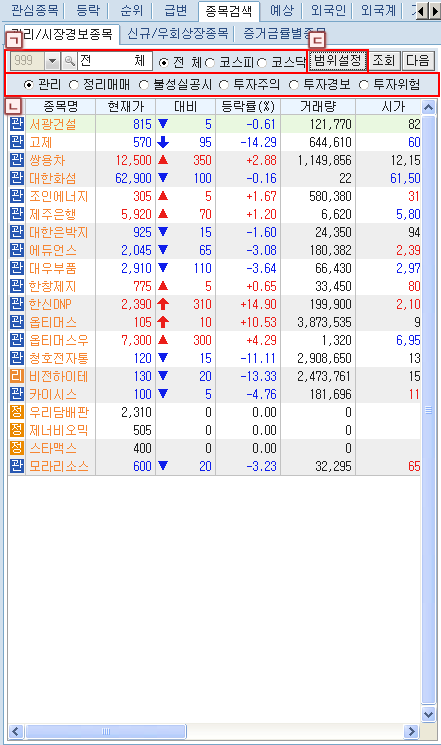 ¹öưÀ» Ŭ¸¯Çϸé Á¤±Ô½ÃÀå¿¡¼ÀÇ ÇöÀç ½Ã¼¼»óÅÂ/¿¹»óü°á»óÅÂ/½Ã°£¿Ü»óÅÂ/½Ã°£¿Ü+¿¹»óü°á»óÅ µîÀÇ ½Ã¼¼ Á¶È¸ Á¾·ù ¼±Åðú °ü½É±×·ìÀÇ Á¶È¸/ÀúÀå ¹× ±×·ì À̸§ º¯°æ µîÀ» ¼±ÅÃÇÒ ¼ö ÀÖ´Â µµ±¸¹öưÀÔ´Ï´Ù.