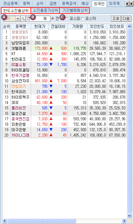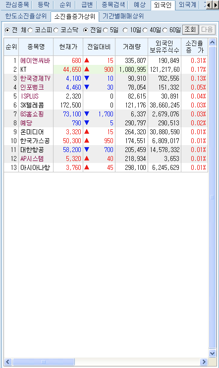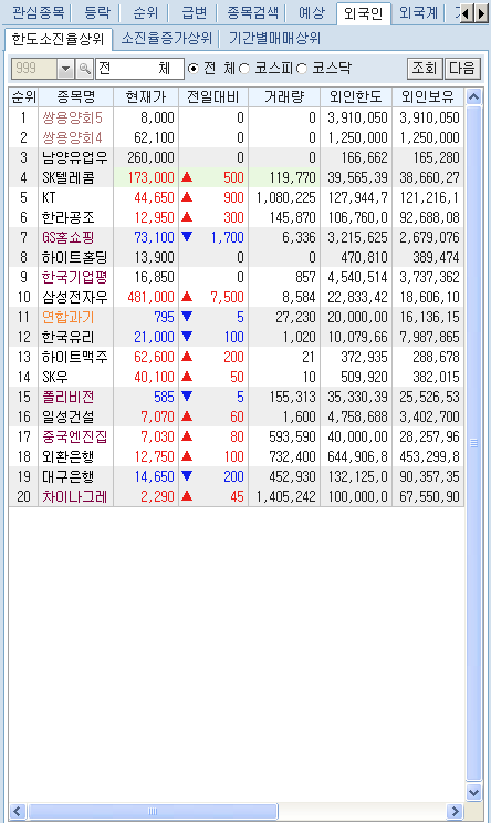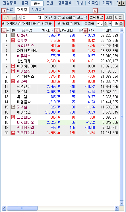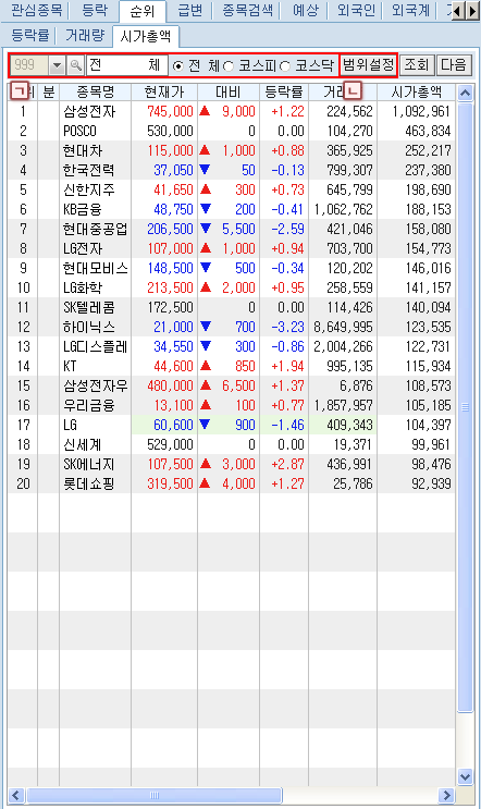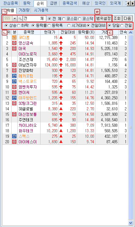 ¹Ì¸® µî·ÏÇÑ °ü½ÉÁ¾¸ñ ¹× µî¶ô, ¼øÀ§, ±Þº¯, Á¾¸ñ°Ë»ö, ¿¹»ó, ¿Ü±¹ÀÎ, ¿Ü±¹°è, °Å·¡¿ø¼ø°£, ¾÷Á¾, Å׸¶º°' µîÀÇ °¢Á¾ ¼øÀ§¿Í ½Ã¼¼Á¶È¸°¡ °¡´ÉÇÕ´Ï´Ù.