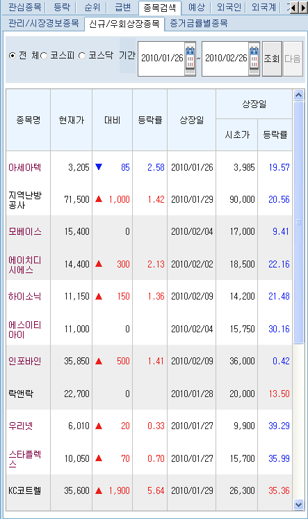 ÁöÁ¤ÇÑ ±â°£ÀÇ ÄÚ½ºÇÇ, ÄÚ½º´Ú ½ÃÀåÀÇ ½Å±Ô/¿ìȸ»óÀåÁ¾¸ñ Á¾¸ñ ¸®½ºÆ®¿Í ½Ã¼¼ÇöȲÀ» Á¶È¸ÇÒ ¼ö ÀÖ½À´Ï´Ù.