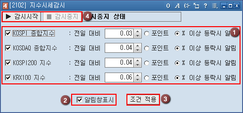 ¡®KOSPI, KOSDAQ, KOSPI200, KRX100¡¯ Áß ½Ã¼¼°¨½Ã¸¦ ¿øÇÏ´Â Áö¼ö¸¦ ¼±ÅÃÇϽðí, °¨½ÃÁ¶°ÇÀ» ÇÕ´Ï´Ù.