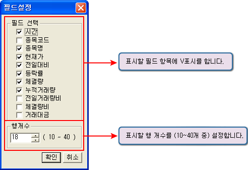 ¹öưÀ» Ŭ¸¯ÇÏ¸é ¡®Çʵ弳Á¤¡¯ ȸéÀÌ ÆË¾÷ µÇ¸ç, Á¶È¸ÇÒ Çʵå Ç׸ñ°ú Çà°³¼ö¸¦ ¼³Á¤ÇÒ ¼ö ÀÖ½À´Ï´Ù.