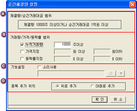¹öưÀ» Ŭ¸¯ÇÏ¸é ¡®¼ø°£Ã¼°á·® ¼³Á¤¡¯ ȸéÀÌ ÆË¾÷ µÇ¸ç, ¼ö½ÅÇÒ ¼ø°£Ã¼°á·® Á¶°Ç ¹× ±â´É, Á¾¸ñÃß°¡ À§Ä¡ µîÀ» ¼³Á¤ÇÒ ¼ö ÀÖ½À´Ï´Ù.