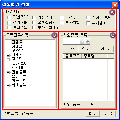¹öưÀ» Ŭ¸¯ÇÏ¸é ¡®°Ë»ö¹üÀ§ ¼³Á¤¡¯ ȸéÀÌ ÆË¾÷ µÇ¸ç, ´ë»óÁ¦¿Ü Ç׸ñ°ú Á¾¸ñ ±×·ìÀÇ Ãß°¡ ¹× »èÁ¦ÇÒ ¼ö ÀÖ½À´Ï´Ù.