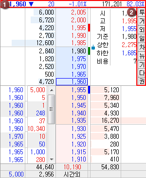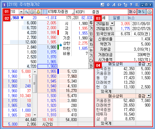종목의 10단계 호가 및 매수/매도 잔량현황 및 각 연결버튼을 통하여 정보를 조회할 수 있으며, 종목 투자에 도움을 주는 영역입니다.