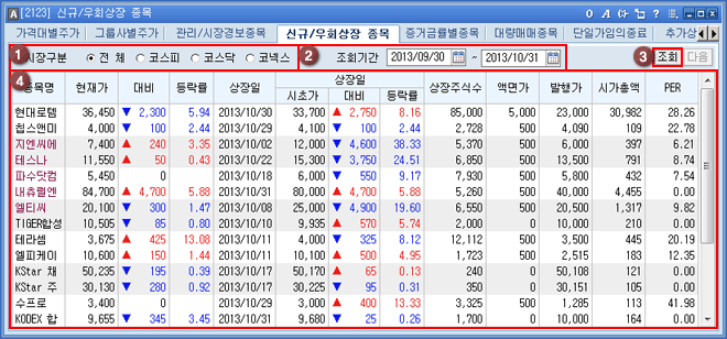 ¼±ÅÃÇÑ ½ÃÀåÀÇ ½Å±Ô ¶Ç´Â ¿ìȸ»óÀåÇÑ Á¾¸ñ ¸®½ºÆ®¿Í ½Ã¼¼ÇöȲ ¹× ¡®½ÃÃʰ¡, ´ëºñ, µî¶ôÀ²¡¯ µîÀÇ »óÀåÀÏ ÇöȲÀ» Á¶È¸ÇÒ ¼ö ÀÖ½À´Ï´Ù.
