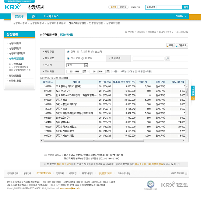 °Å·¡¼Ò¿¡¼ Á¦°øÇϴ ȸéÀ¸·Î ¼³Á¤ÇÑ ±â°£ µ¿¾È °Å·¡¼Ò¿Í ÄÚ½º´Ú ½ÃÀå¿¡ ½Å±Ô»óÀåÀ̳ª Àç»óÀå Á¾¸ñµéÀÇ '»óÀåÀÏ/ »óÀåÁֽļö/ °ø¸ð°¡' µîÀÇ µ¥ÀÌÅ͸¦ Á¶È¸ÇÒ ¼ö ÀÖ½À´Ï´Ù.