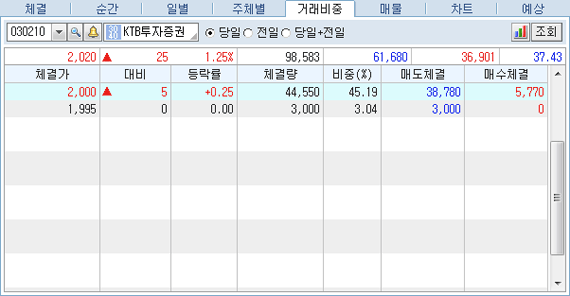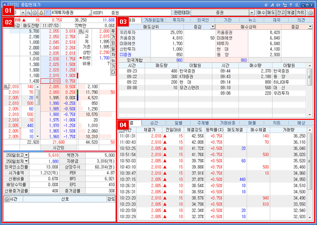 종목의 실시간별/순간/일자별 체결현황과 주체별/매물의 매매현황과 예상주가추이, 미니차트를 조회할 수 있습니다.