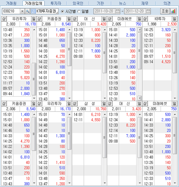 거래원입체 : 선택한 종목의 당일 매도/매수 상위 10개 회원사의 거래를 시간별/일별로 파악할 수 있는 화면으로, 당일 종목에 대한 매수/매도의 주체가 되는 거래원의 파악에 유용한 화면입니다.