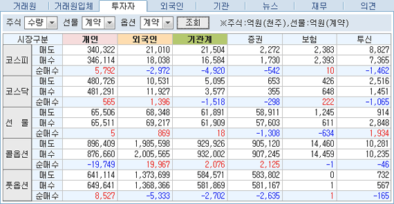 투자자 : 개인/외국인/투자자의 매도/매수/순매수 매매현황을 조회할 수 있습니다
