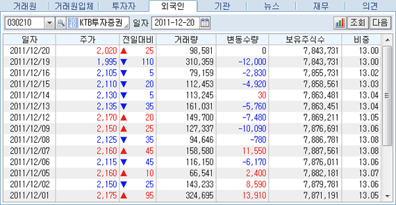 외국인: 외국인의 전일대비, 거래량 등의 매매현황을 일별로 조회할 수 있습니다
