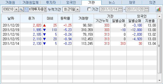 기관: 기관의 종가, 등락률, 거래량 등의 매매현황을 최근5일, 1개월, 3개월, 6개월, 1년 또는 기간을 직접 선택해서 조회할 수 있습니다