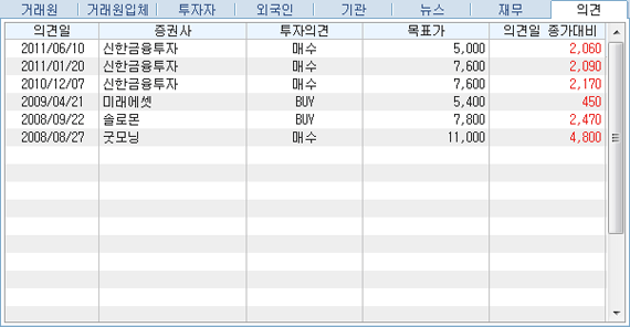 의견 : 종목에 대한 증권사의 투자 의견, 목표가, 의견일 종가대비 현황을 조회할 수 있습니다.