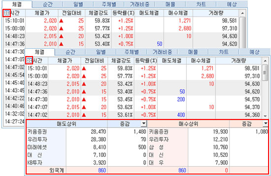 체결 : 실시간별 체결현황 및 매도매수 상위 5개 증권사 의 매매현황을 조회할 수 있습니다.