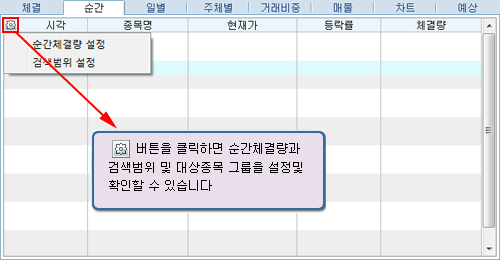 순간 : 설정해 놓은 종목들을 대상으로 미리 설정해 놓은 순간체결량이 발생했을 경우 해당 종목과 현재가, 체결량을 데이터와 소리로 조회할 수 있습니다.