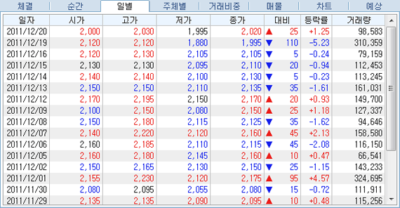 일별 : 종목의 일자별 주가 추이현황을 조회할 수 있습니다.