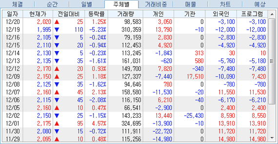 주체별 : 개인/기관/외국인/프로그램 등의 일자별 매매현황을 투자주체별로 조회할 수 있습니다.