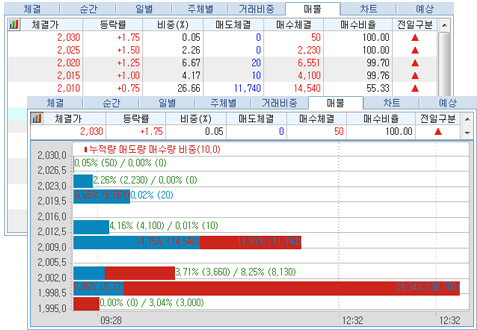 호가잔량 막대그래프 보기 : 호가창에 매도.매수 잔량현황을 막대 그래프로 표시합니다.