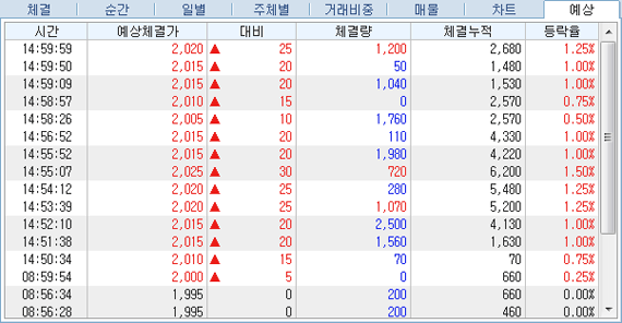 예상 : 장 전후 동시호가 시간대의 예상 주가추이를 조회할 수 있습니다