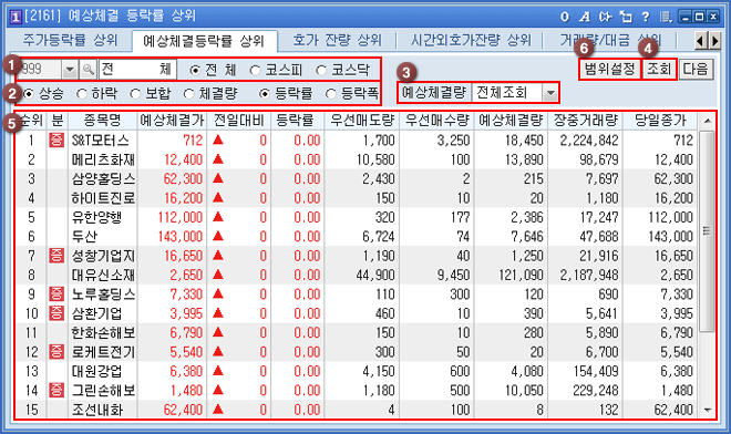 Á¶È¸µÈ Á¾¸ñµéÀÇ "¼øÀ§,ºÐ·ù,Á¾¸ñ¸í,¿¹»óü°á°¡,ÀüÀÏ´ëºñ,µî¶ô·ü,¿ì¼±¸Åµµ·®,¿ì¼±¸Å¼ö·®,¿¹»óü°á·®,ÀåÁß°Å·¡·®,´çÀÏÁ¾°¡"À» Á¶È¸ÇÒ ¼ö ÀÖÀ¸¸ç, °¢ Ç׸ñÀ» Ŭ¸¯ÇÏ¸é ¿Ã¸² ȤÀº ³»¸²Â÷¼øÀ¸·Î ÀçÁ¤·ÄÇÏ¿© º¸½Ç¼ö ÀÖ½À´Ï´Ù.
