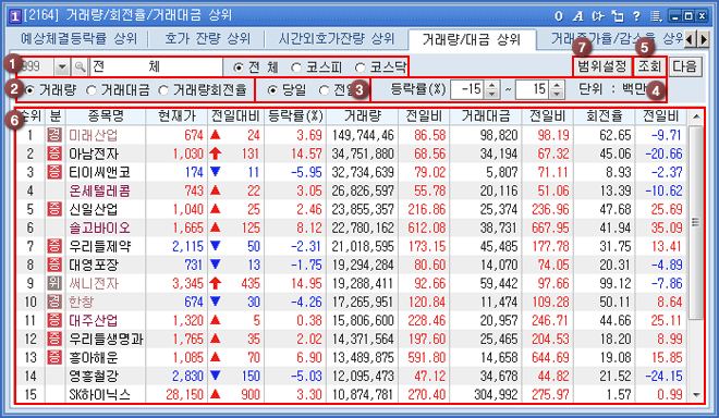 ÇØ´ç Á¶°ÇÀ» ¸¸Á·½ÃŰ´Â °Å·¡·®/ȸÀüÀ²/°Å·¡´ë±Ý »óÀ§Á¾¸ñ ¸®½ºÆ®¿Í ½Ã¼¼ÇöȲÀ» Á¶È¸ÇÒ ¼ö ÀÖ½À´Ï´Ù.