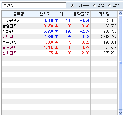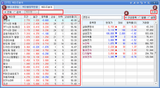 ¼½ÅÍ¸í ¸®½ºÆ®¿Í ¡®ÁÖ°£, ¿ù°£, µî¶ôÀ², »ó½Â. Ç϶ô, »ó½ÂºñÀ²(%)¡¯ µîÀÇ µî¶ôÀ² ÇöȲÀ» Á¶È¸ÇÒ ¼ö ÀÖÀ¸¸ç, Á¶È¸¸¦ ¿øÇÏ´Â ¼½Å͸íÀ» ¼±ÅÃÇϽøé ÁÂÃøÈ¸éÀÌ ¼±ÅÃÇÑ ¼½ÅÍ¿¡ ±¸¼ºÇϰí ÀÖ´Â