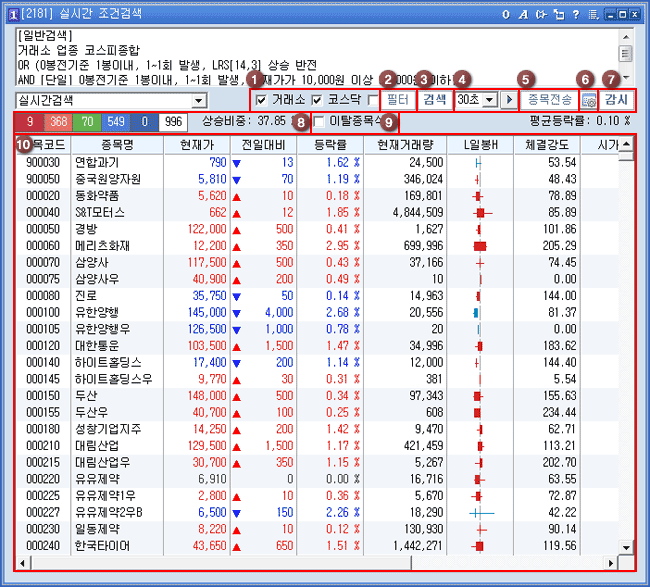 설정한 조건들에 의한 종목들을 조회할 수 있습니다.
