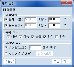 버튼을 클릭하면 '필터설정' 창이 팝업 되며, 대상종목/등락구분/거래량범위 등을 설정할 수 있습니다.