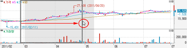 차트에서 확대/축소 하는 방법으로 마우스 왼쪽 마우스로 드래그하여 찾으려는 패턴 기간을 지정합니다.