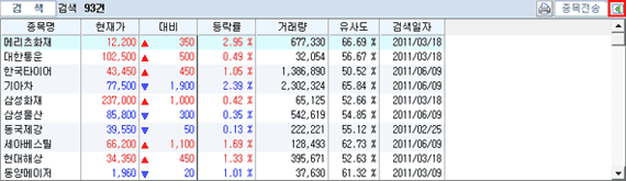 종목전송 : 검색된 종목들을 종합차트/관심등록/Excel 화면으로 전송하는 기능입니다.