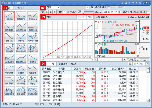 유사도 : 찾고자 하는 추세패턴의 유사도를 지정하여 검색하는 기능으로 유사도는 추세패턴 검색 로직에 근거하여 유사도 기준 이상의 추세를 검색합니다. 유사도가 높을수록 추세패턴의 정확도가 높아지나, 검색 종목수는 적어질 수 있습니다.