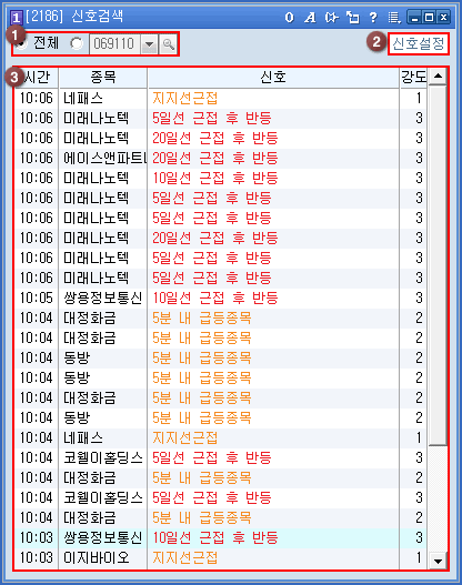 설정한 신호에 해당하는 종목 리스트와 신호 강도를 조회할 수 있습니다.