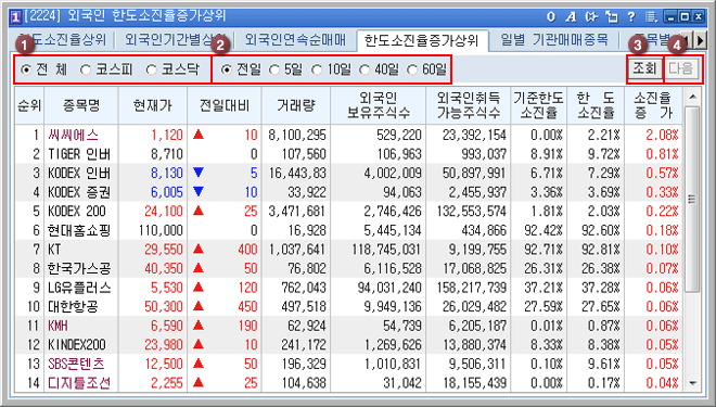 ¹öưÀ» Ŭ¸¯ÇÏ½Ã¸é ¡°¿Ü±¹ÀÎ Çѵµ¼ÒÁøÀ²Áõ°¡»óÀ§¡± Á¾¸ñµéÀÌ Á¶È¸µË´Ï´Ù.