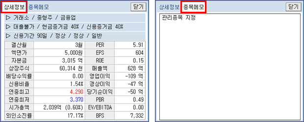 Á¾¸ñ¸íÀÇ ÁÂÃøÀÇ ¼öÄ¡´Â Çö±Ý ¹× ½Å¿ëÁõ°Å±ÝÀ²À» ÀǹÌÇϸç, Á¾¸ñ¸íÀ» Ŭ¸¯Çϸé Á¾¸ñ »ó¼¼Á¤º¸ Á¶È¸ ¹× Á¾¸ñ¿¡ ´ëÇÑ °£´ÜÇÑ ¸Þ¸ð ÀÔ·ÂÀÌ °¡´ÉÇÕ´Ï´Ù.