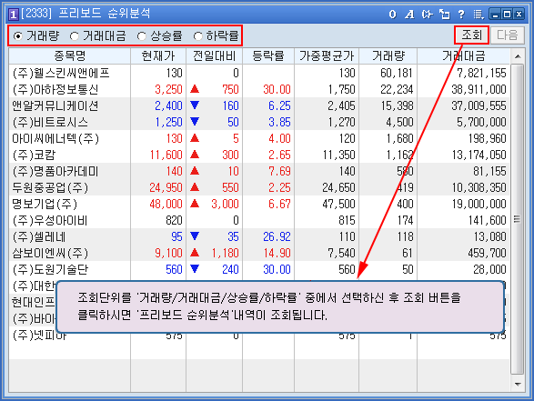 ÇÁ¸®º¸µå¿¡¼ °Å·¡µÇ°í ÀÖ´Â Á¾¸ñµéÀÇ ¡°°Å·¡·®, °Å·¡´ë±Ý,»ó½Â·ü,Ç϶ô·ü¡± ¼øÀ§¸¦ Á¶È¸ÇÒ ¼ö ÀÖ½À´Ï´Ù.