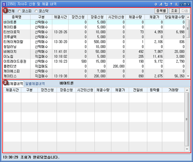 Á¶È¸ÇÒ ½ÃÀåÀ» ¡°Àüü/ÄÚ½ºÇÇ/ÄÚ½º´Ú¡± Áß¿¡¼ ¼±ÅÃÇϽŠÈÄ, ¹öưÀ» Ŭ¸¯ÇϽøé ÀÚ»çÁÖÀÇ ¡°ÀåÀü/ÀåÁß ¸Åµµ/ ¸Å¼ö ½Åû¡± ³»¿ª µîÀ» Á¶È¸ÇÏ½Ç ¼ö ÀÖ½À´Ï´Ù.