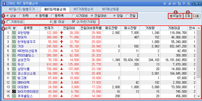 상승, 하락, 등락율, 등락폭, 시가대비, 전일대비 중 조회 할 기준을 선택, 당일, 전일' 중 조회할 기준을 선택합니다.